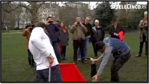 Wie uns Ursula Herzog mitteilte findet regelmässig ein Treffen von internationalen aficionados in der britischen Hauptstadt London statt. Veranstaltet wird dieses toreo de salón vom Club Taurino of London (siehe SfA: Auch in London gibt es Afición). Und da stehen die aficionados auf dem grünen Rasen des St. James Park, gleich in der Nähe der königlichen Residenz, dem Buckingham Palace, und üben sich in der arte del toreo. Diesmal unter der Anleitung des matador de toros aus Murcia Rafaelillo zeigen sie, wie sie das Führen der muleta beherrschen. Er selbst sagt dazu, "Es ist eine wunderbare Erfahrung. Hier habe ich die Möglichkeit mit meinem Wissen zu vermitteln, was man als torero fühlt."